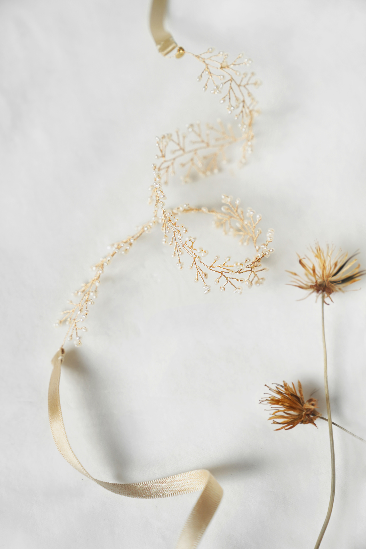 这个系列,由日本匠人精心制作,一粒粒手工挑选的淡水珍珠,细小莹润,富有天然有机的不规则质感,极其纤细的镀金铜丝,绞合缠绕,犹如自然生长的枝蔓,像极了一枝一簇的满天星。