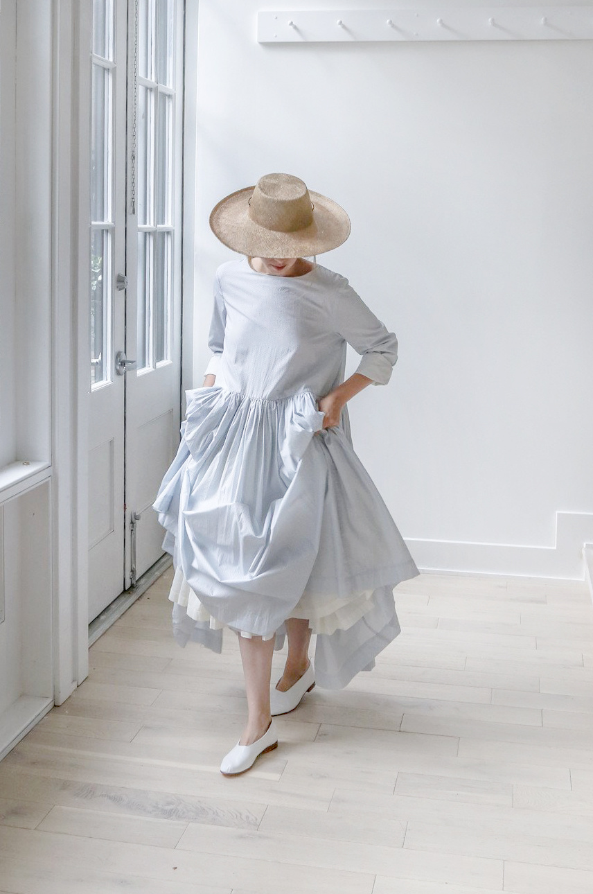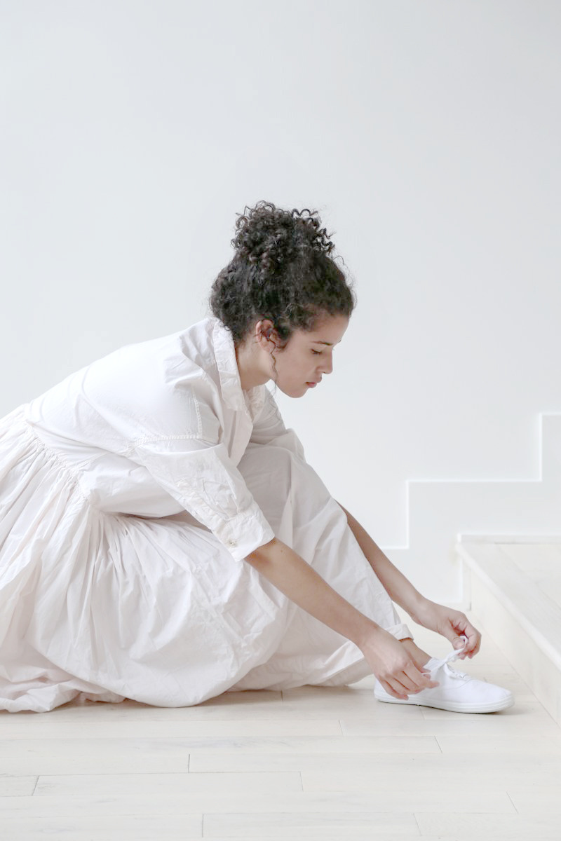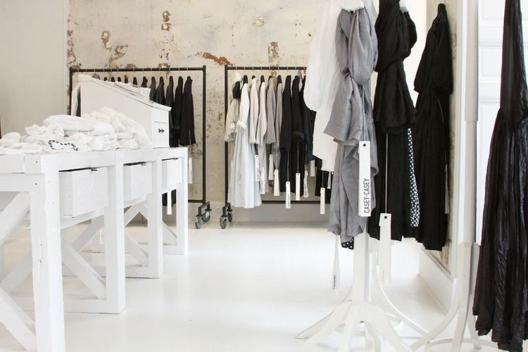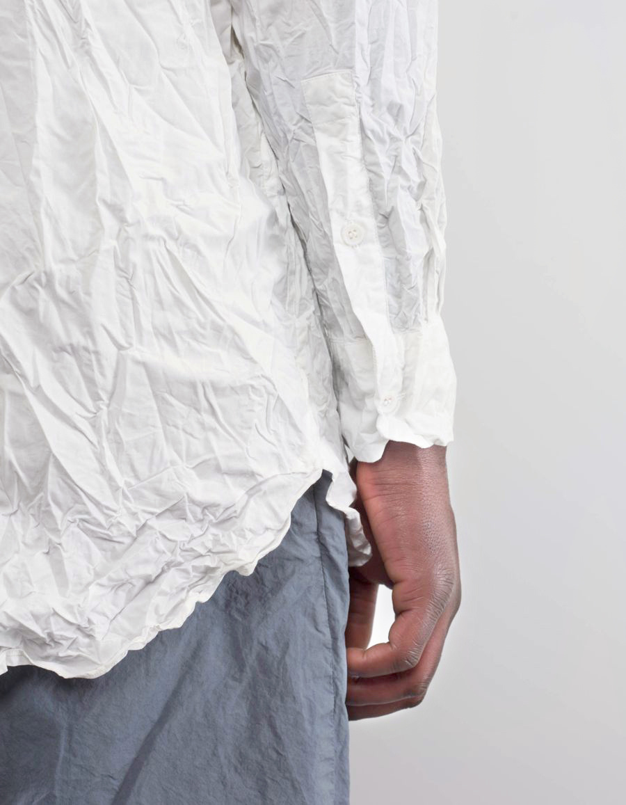 染色、洗涤、压皱,仿旧工艺使面料拥有微妙的光泽和柔韧的质地,遍布的褶皱也成为CASEY CASEY强烈而独特的风格。这些褶皱绝不是随意处理的乱皱,而是跟随身体走向与动势所精心“设计”的,无需熨烫便自有一番生动的韵味。