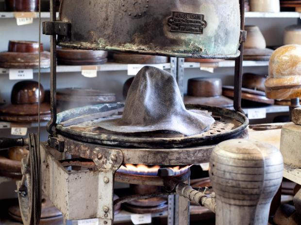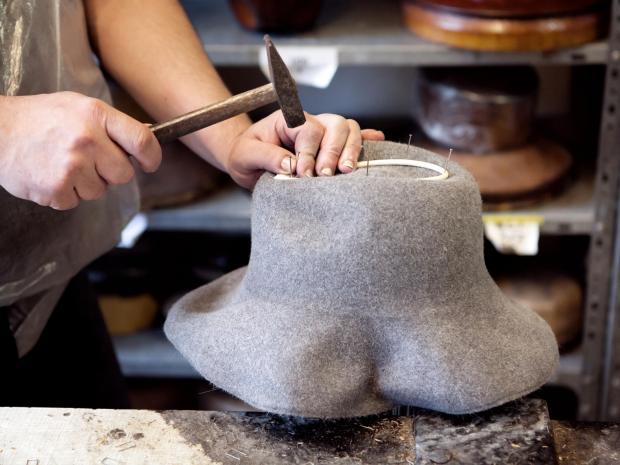 即使融入了现代帽饰风格,Mühlbauer传统的手工制帽技艺也从未改变,在用料方面更是毫不妥协。制帽师用手固定出想要的形状,用蒸汽定型后再把潮湿的帽子烘干,料子变得柔软又结实,最终将边缘修剪缝合而成。