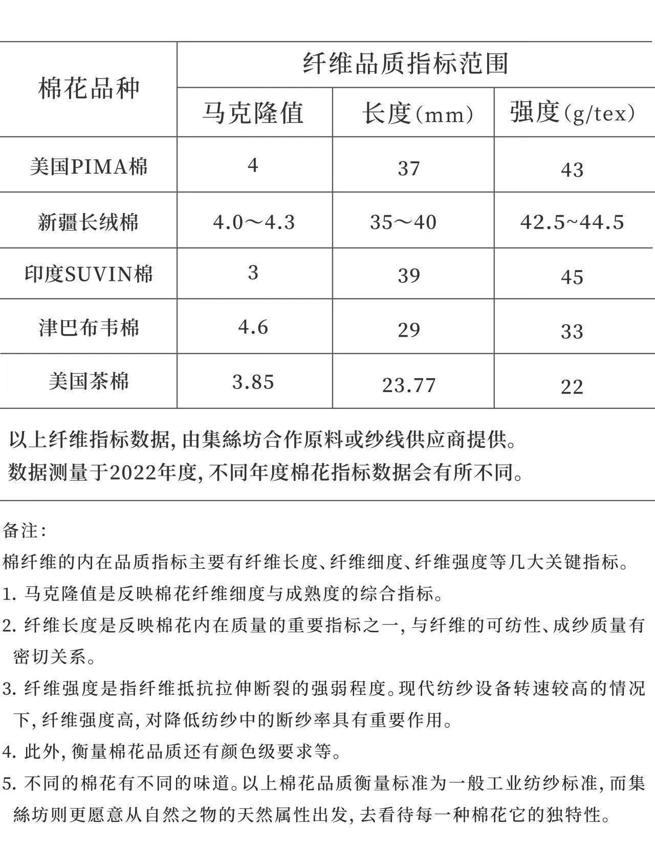 2018年集絲坊创立服装与生活方式品牌,至今我们陆续使用了美国PIMA棉、印度SUVIN棉、新疆长绒棉等世界优质长绒棉、以及津巴布韦棉、美国茶棉等一些特别的棉花品种,并应用到「迟集」的系列产品开发中。