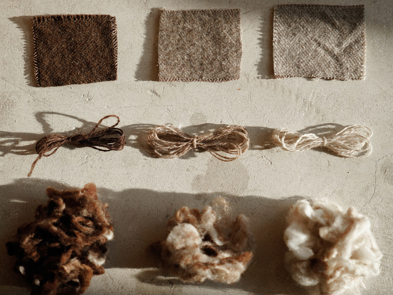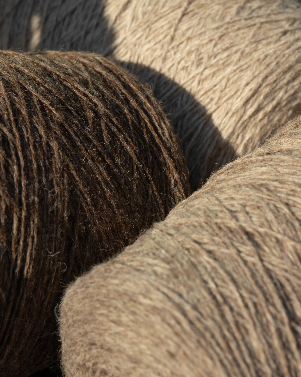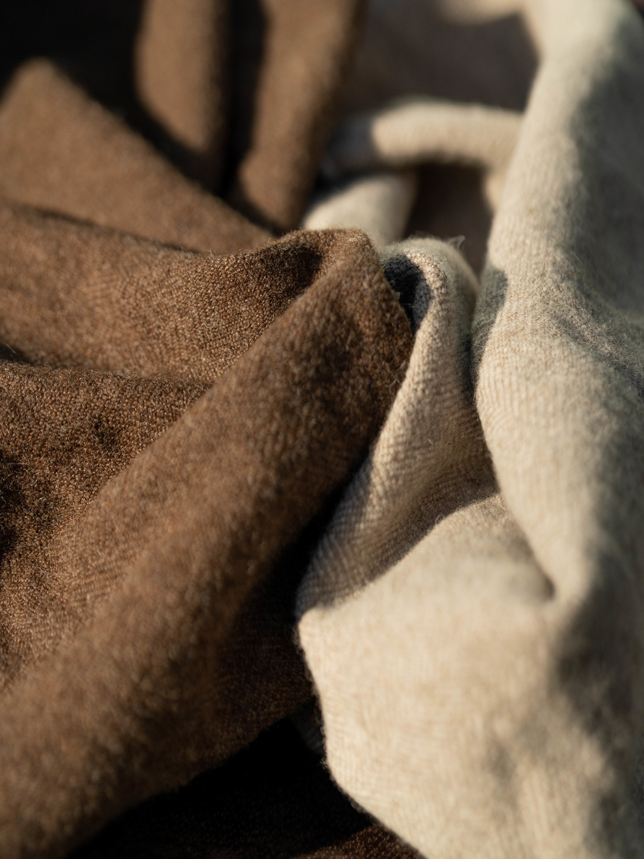 其中一款纱线使用了高等级澳大利亚原色羊毛为原料。从健康的羊群身上获取这部分精细的原色羊毛,质地干净、纯粹,呈现出自然好看的天然色彩:本白、浅棕和深棕。