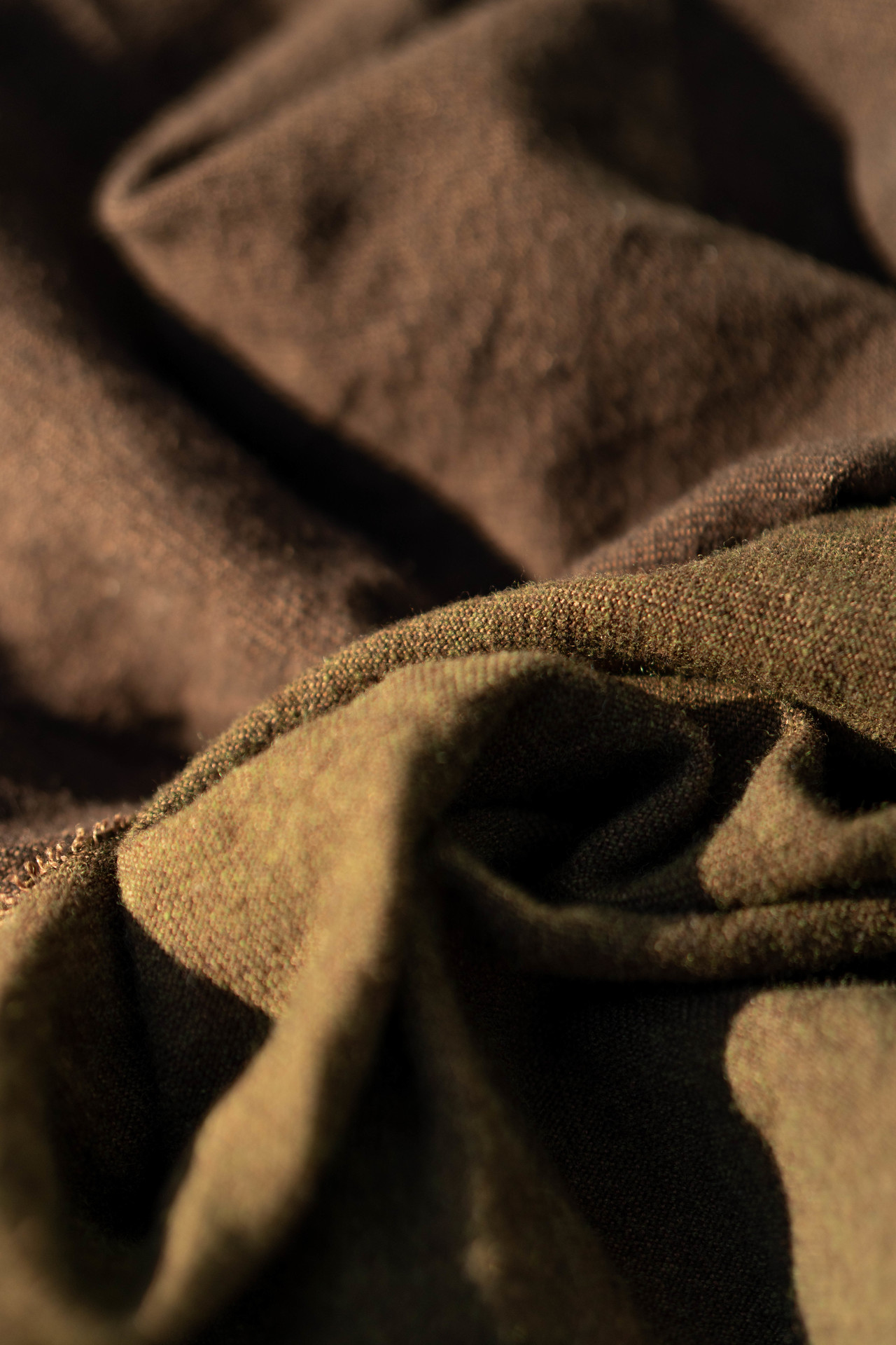 另一款塔斯马尼亚羊毛纱线,质感更为细腻。亚麻纱线穿梭其中,织成的面料更多保留了亚麻的张力,正反面双色的效果,带有明显的编织纹理,多了一份手工老布的味道。